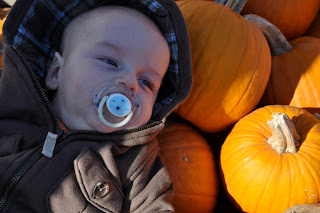 With Grandma and Grandpa Gregg in town for a few days and some gorgeous fall weather, we decided to take Jonah to Barthel Fruit Farm in Mequon to pick some pumpkins from their patch. Although it was somewhat late in the season, we still found some great pumpkins in the patch and came back with 14 for the reasonable price of $25. Grandma Gregg bought some apples (we bought some last month), I nursed under a beautiful tree, and Grandma and Grandpa played with the orchard's two dogs. Jonah probably didn't really know what was going on, but seemed to have a great time taking it all in.